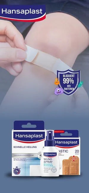 Spray Plaster: The Hansaplast Spray Plaster forms a transparent, waterproof protective film over the wound and is particularly suitable for hard-to-reach areas.