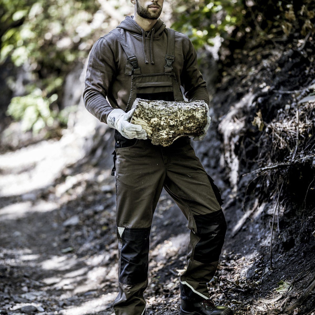 The NITRAS MOTION TEX PLUS dungarees in brown/black (color code: 5010) offer a high level of comfort with their breathable material and stretchy waistband. The canvas reinforcements on the leg, knee and back pockets as well as on the outer bib pocket and the leg cuffs ensure additional durability. Robust triple seams and reflective elements improve visibility. Equipped with practical extras such as thigh pockets with flaps, ruler pocket, inner bib pocket with YKK zipper and knee pockets for padding, these trousers are the ideal companion for demanding work. The high-quality workmanship is rounded off by the OEKO-TEX STANDARD 100® and the optionally available knee protection 76K (EN 14404).
